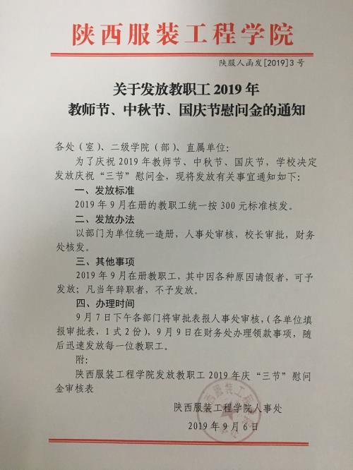 关于发放教职工2019年教师节、中秋节、国庆节慰问金的通知