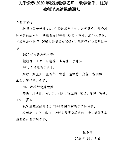 关于公示2020年校级教学名师、教学骨干、优秀教师评选结果的通知