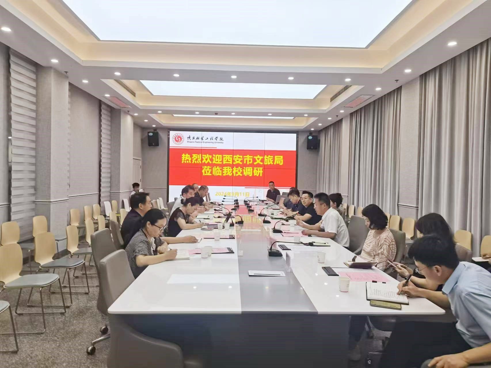 陕服新闻网讯(李文斌)9月11日下午,西安市文旅局张怡恺一行到我校考察调研。我校副校长吴俊林、党委副书记刘继兵陪同调研。
