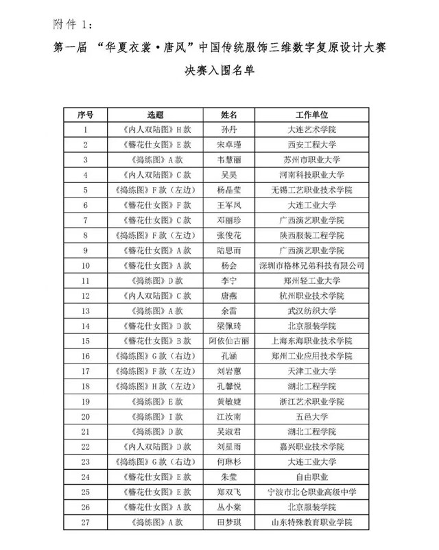 陕服新闻网讯(李文斌)由中国纺织服装教育协会主办,我校承办的全国第一届“华夏衣裳.唐风”中国传统服饰三维数字复原设计大赛初赛已于10月12日结束。本次大赛共收到来自全国134所院校及企业作品参赛,评选出50件作品进入决赛。我校服装学院教师张俊花、 张盼、 陈宇佳三人的作品成功入围,进入决赛。