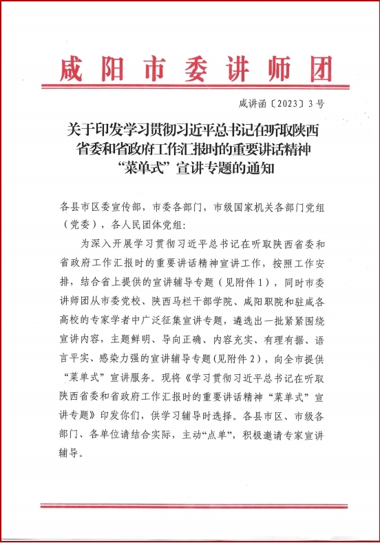 陕服新闻网讯( 菅建伟)为进一步推动学习贯彻习近平新时代中国特色社会主义思想主题教育走深走实,深入学习贯彻习近平总书记在听取陕西省委和省政府工作汇报时的重要讲话精神,根据中共咸阳市委讲师团《关于征集学习贯彻习近平总书记在听取陕西省委和省政府工作汇报时的重要讲话宣讲专题的通知》,我校马克思主义学院教师侯帆、吴文娟、韩雨颖选报的宣讲题目《强化教育、科技、人才一体化发展理念,推动陕西高等教育高质量发展》《全面推动建设陕西人与自然和谐共生的现代化》《用好陕西历史文化资源和红色文化资源》入选咸阳市“菜单式”宣讲专题。