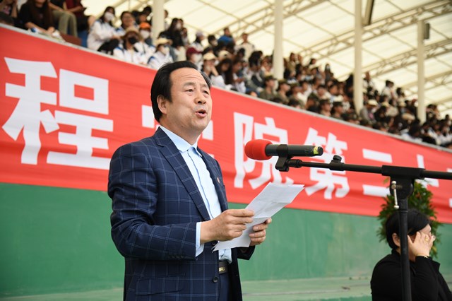 李宗领致闭幕辞。他指出,学校第22届田径运动会已完成所有赛程,运动会安全高效,热火朝天,留下了一幕幕精彩瞬间。入场式上各代表队具有专业特色的服装秀、青春舞、健康卫士、动车组等别开生面,开幕式上健身动起来、吉祥腰鼓、舞动青春、惟舞独尊等令人记忆犹新,展示了陕服学子阳光自信和高雅的艺术新风尚。竞技场上运动员们不畏烈日,勇于挑战自我,展现了陕服学子勇毅顽强的品格和更快更高、更强更团结的精神追求。裁判员们一丝不苟、严谨认真,把时间、距离的计量精准再精准,彰显了陕服人严谨认真的作风和敬业精神。看台上同学们的加油声一声高过一声,没有让运动员们感到孤单,展现了陕服学子们的高尚道德情操和团结友爱的精神。一幕幕动人的情景、精彩的瞬间必将成为我们永恒的记忆。令人欣喜的是女子铅球破了我校保持11年的记录,还有多个项目创下了近年来的最高纪录。他衷心为同学们点赞。