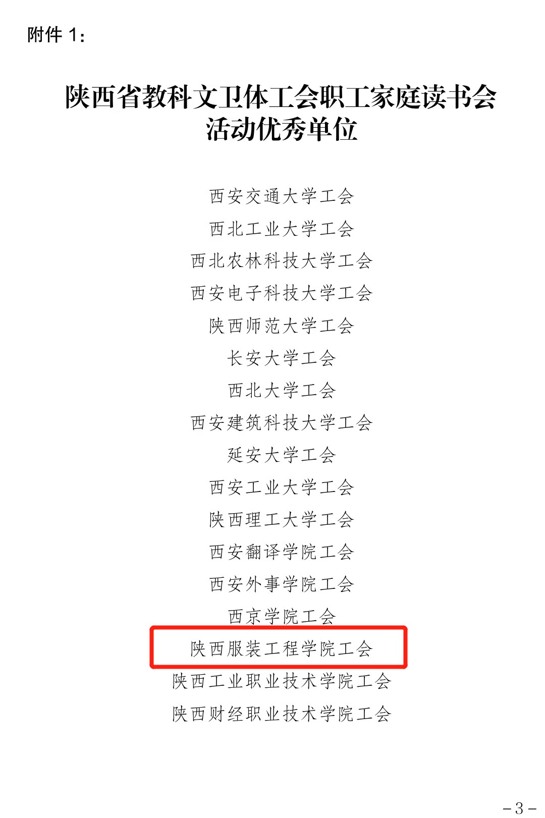 陕服新闻网讯(李文斌)近日,陕西省教科文卫体工会为发挥先进模范作用,进一步推进职工家庭读书会活动广泛开展,表彰了一批职工家庭读书会活动优秀单位和优秀家庭。省教科文卫体工会结合各基层工会日常活动开展和宣传情况,经过日常调研、查阅总结和会议研究等程序,评选出西安交通大学工会等 22 家优秀单位,陆卫明等 22 个优秀家庭。我校被评为优秀单位、艺术设计学院李国瑞家庭被评为优秀家庭。