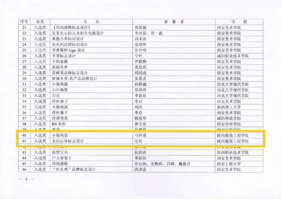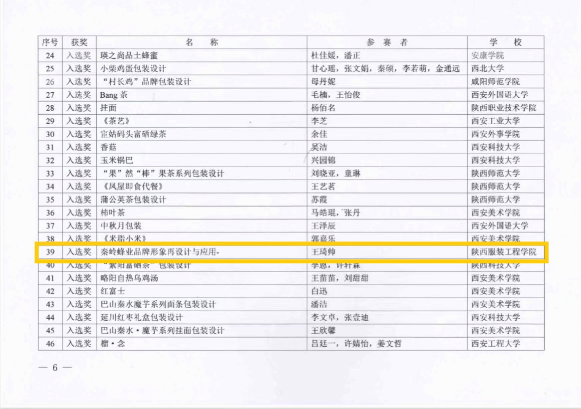 本届大赛由陕西省委教育工委、省教科文卫体工会主办,西安美术学院承办,省内52所高校1695组作品参赛。我校学生彭文欣作品《鱼河富硒大米包装创新设计》获得陕西省农特产品包装设计学生组一等奖;学生王琦帅作品《秦岭蜂业品牌形象再设计与应用》获得陕西省农特产品包装设计学生组入选奖;学生马梓萌作品《小柴鸡蛋》、学生张航作品《太白山珍标志设计》获得陕西省农特产品品牌标志命题设计学生组入选奖。朱小军老师获得优秀指导教师奖。学校获得优秀组织单位奖。