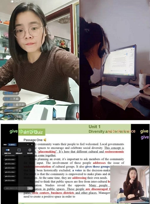 教学工作开展情况良好。各位老师备课认真,制定合理的教学计划,整理完备的教学资料。为了克服线上教学的困难,如网络不畅导致的直播卡顿等问题,老师们准备预案,电脑和手机结合来开展教学,部分老师采用雨课堂+钉钉完美结合的授课模式。为了增强线上教学的互动,让同学们在这特殊的疫情期间“愿学、乐学、想学”,老师们不断创新教学内容和形式,听力听练+口语练习+写作讲练+阅读讲练+小组互动+师生对话等形式使得课堂内容丰富多彩。