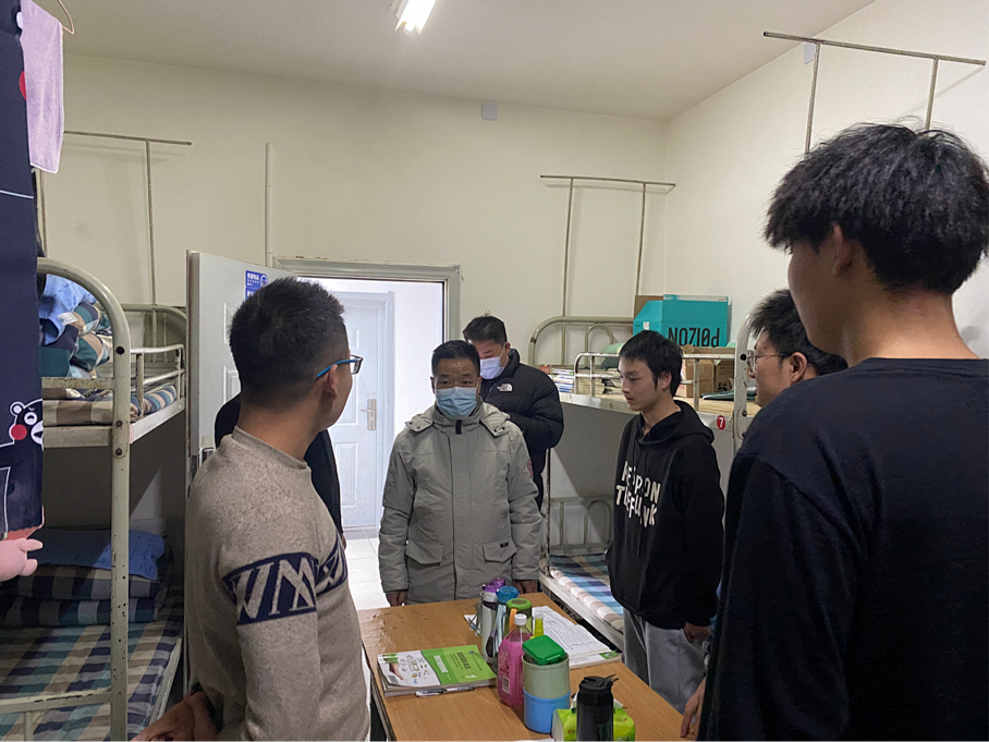 陕服新闻网讯(交通学院)近期,全国疫情发展形势严峻复杂,而西安疫情正处于关键时刻,部分区域实行管控和封控。封闭管理下的同学们也忧心焦虑于疫情的每日发展,为及时了解同学们的思想动态及学习生活情况,引导和教育学生严格遵守各项疫情防控规定,理性看待特殊时期学校的管理制度,合理安排好自身的学习和生活,12月25日,我校交通学院党支部书记、副院长常利群、院长助理葛成、团总支书记郭凡凡老师走访学生宿舍,将学校的关心与爱护送到同学们的心坎上,切实关心学生身体健康状况,将学校疫情防控政策落到实处。