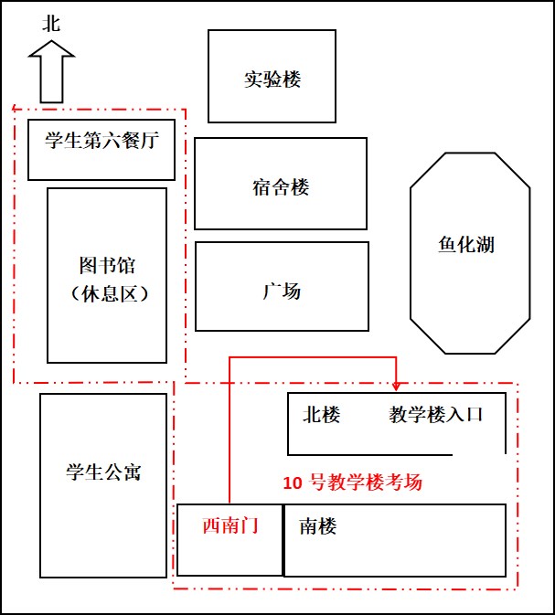 注:1、红色虚线部分为考生可通行区域;2、到达南楼路线:10号教学楼进入→步行至三楼→穿过南北楼连接走廊→到达南楼。