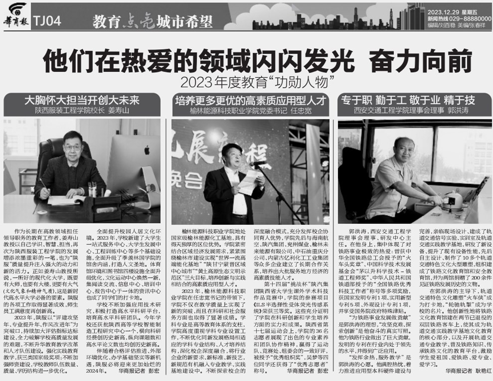 陕服新闻网讯(李文斌)2023年12月29日,备受瞩目的“教育点亮一座城”2023陕西教育年度典范评选活动结果揭晓,经过严格的筛选与评估,陕西教育界中的高校、职业院校以及职高学校的卓越典范得以璀璨呈现。