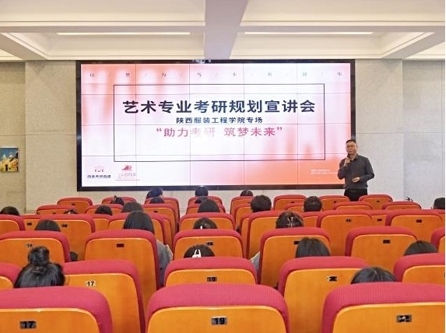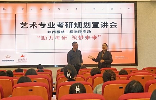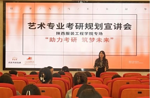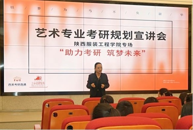 陕服新闻网讯(服装学院)10月10日下午,服装学院邀请上海袋研教育集团有限公司西安运营中心总监、艺术考研辅导课程体系研究专家许世博老师,为学院进行“助力考研 筑梦未来”艺术专业考研规划宣讲会。服装学院院长张莉、服装学院副院长刘红、服装学院副院长李玉玫、现代产业学院副院长吴朝辉、服装学院部分教师及备战考研的2020级、2021级部分学生参加了本次宣讲会。
