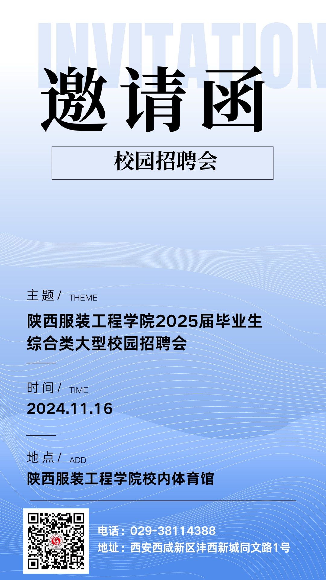 学校设有服装学院、艺术设计学院、信息工程学院、教育学院、经济管理学院、健康学院、马克思主义学院、高职学院、基础部、体育部等10个学院(部),有服装设计与工程、环境设计、数字媒体艺术、计算机科学与技术、机械设计制造及其自动化、物联网工程、金融工程、学前教育、制药工程等为特色的本、专科专业66个,2025届毕业生共计4000余人。为深入学习贯彻党的二十届三中全会和全国教育大会精神,贯彻落实就业优先战略相关意见,为用人单位及广大毕业生搭建更加广阔的的交流平台,促进2025届高校毕业生充分高质量就业,我校定于2024年11月16日举办“陕西服装工程学院2025届毕业生秋季大型校园招聘会”。为此,我们诚邀各用人单位莅临我校展示企业形象,诚聘英才。现将会议有关事项敬告如下: