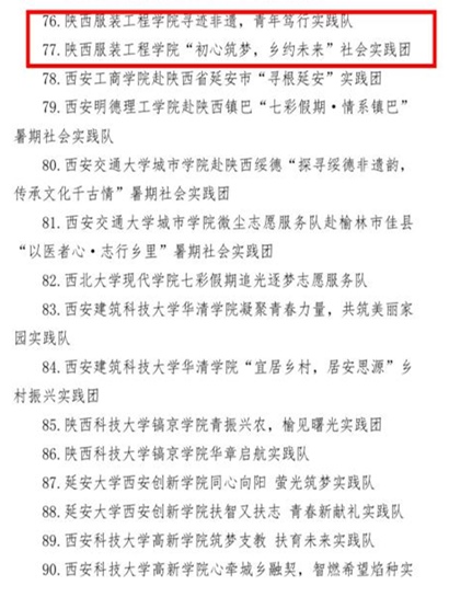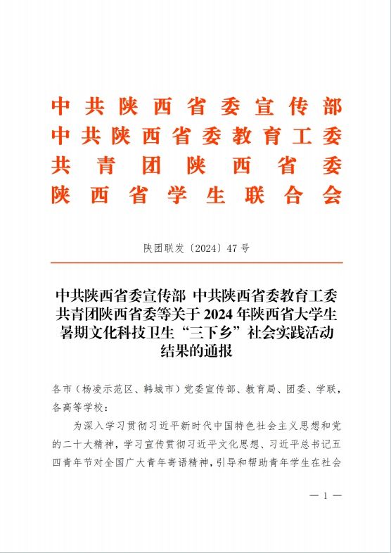 陕服新闻网讯(郭凡凡) 近日,中共陕西省委宣传部、中共陕西省委教育工委、共青团陕西省委、陕西省学生联合会联合下发《关于2024年陕西省大学生暑期文化科技卫生“三下乡”社会实践活动结果的通报》,我校荣获“省级优秀组织单位”“优秀团队”“先进个人”等多项荣誉。