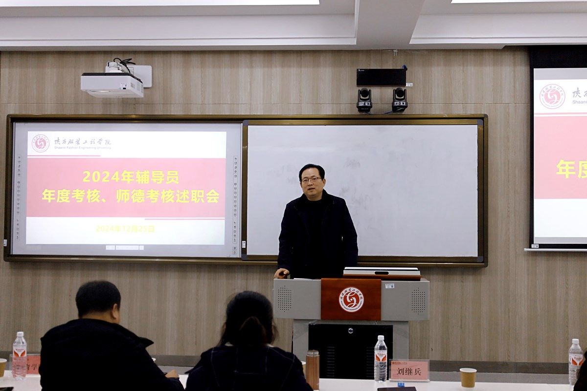 陕服新闻网讯(董良超)为深入学习贯彻党的二十届三中全会和全国教育大会精神,进一步提升我校思想政治工作质量,不断推进辅导员队伍建设,大力培养选树辅导员先进典型,发挥示范引领作用,根据《陕西服装工程学院年度考核办法》的通知要求,12月25日下午,学校举行2024年度辅导员年度考核、师德考核述职评议会。党委副书记刘继兵出席并讲话,各二级学院党委(总支)、学工部、校团委负责同志以及各学院学工办主任、全体辅导员参加会议并担任评委。会议由学工部副部长董良超主持。