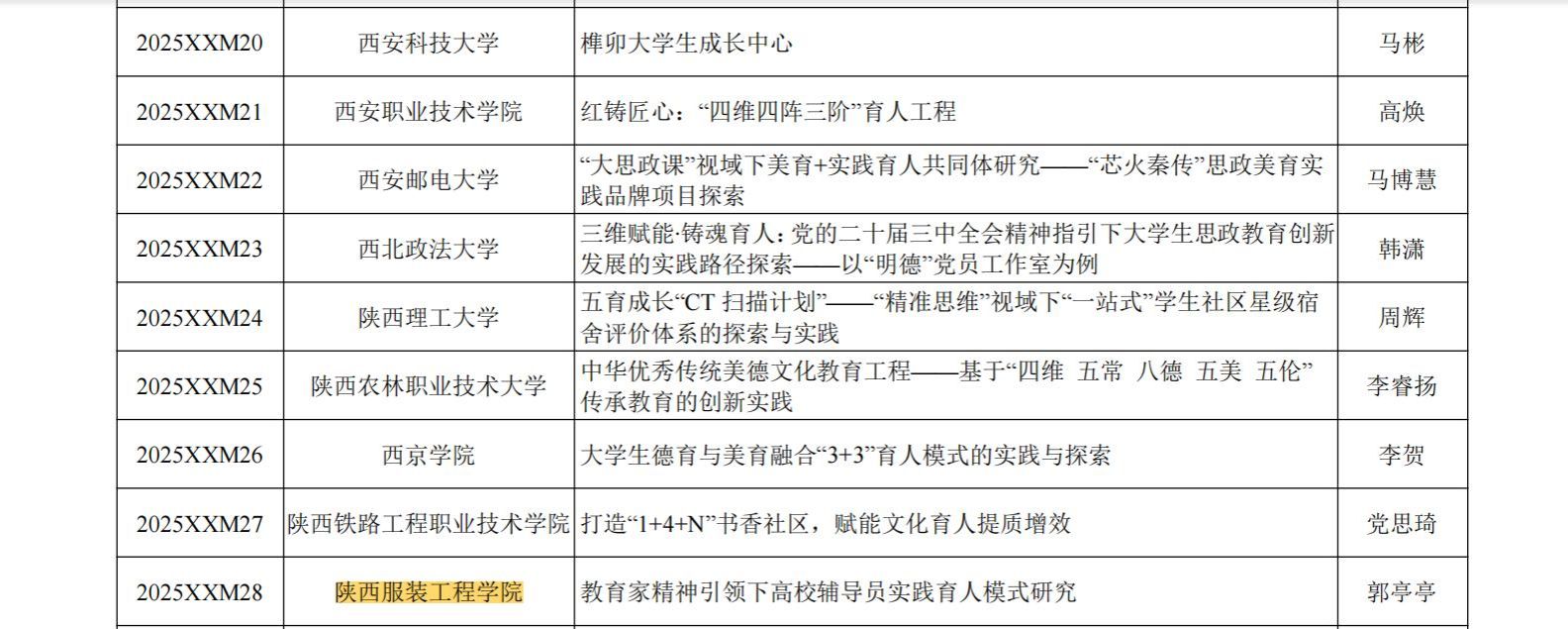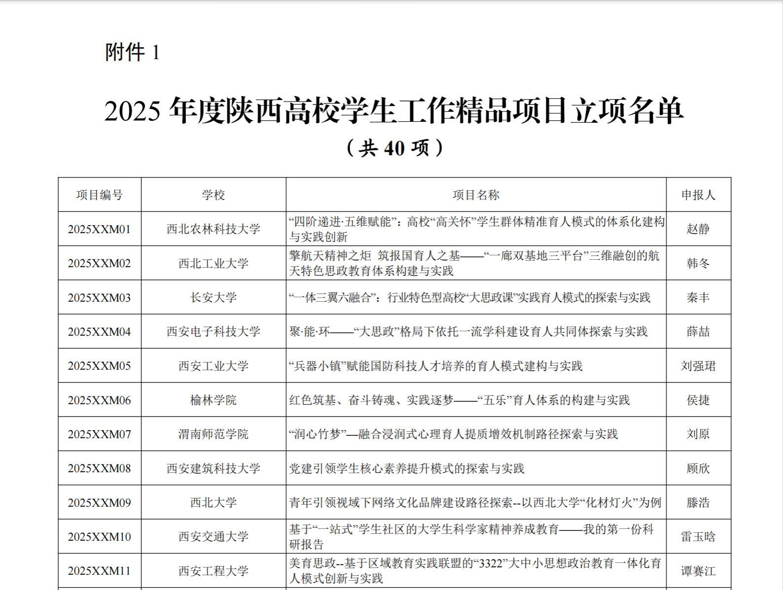 陕服新闻网讯(校团委)近日,陕西省委教育工委公布了2025年度陕西高校学生工作精品项目和研究课题立项名单,我校获批立项1项精品项目、2项研究课题。